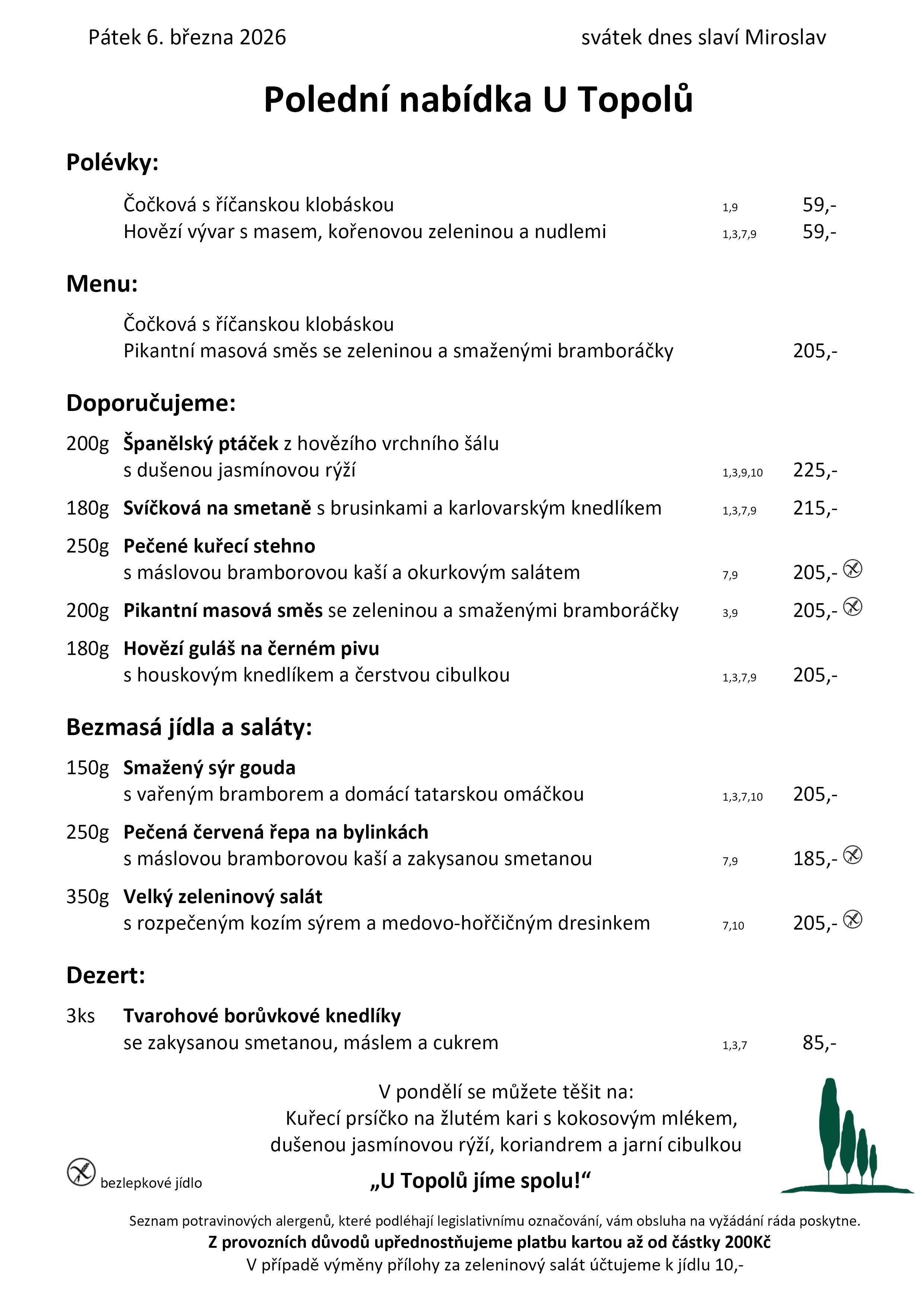 Každodenně nabízíme hotová jídla typická pro českou kuchyni. Samozřejmě podáváme také chuťovky vhodné k pivku a minutky.