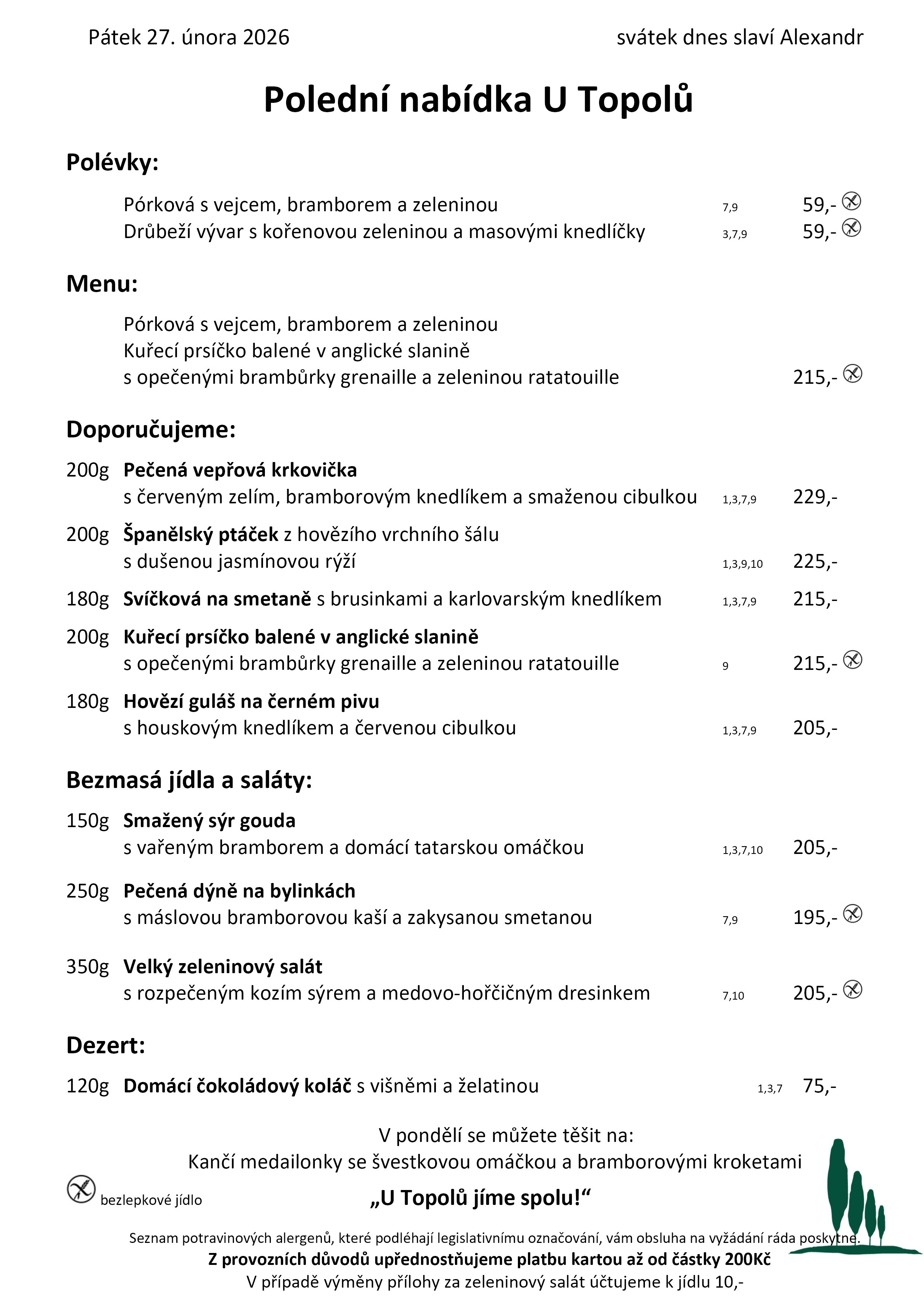 Každodenně nabízíme hotová jídla typická pro českou kuchyni. Samozřejmě podáváme také chuťovky vhodné k pivku a minutky.
